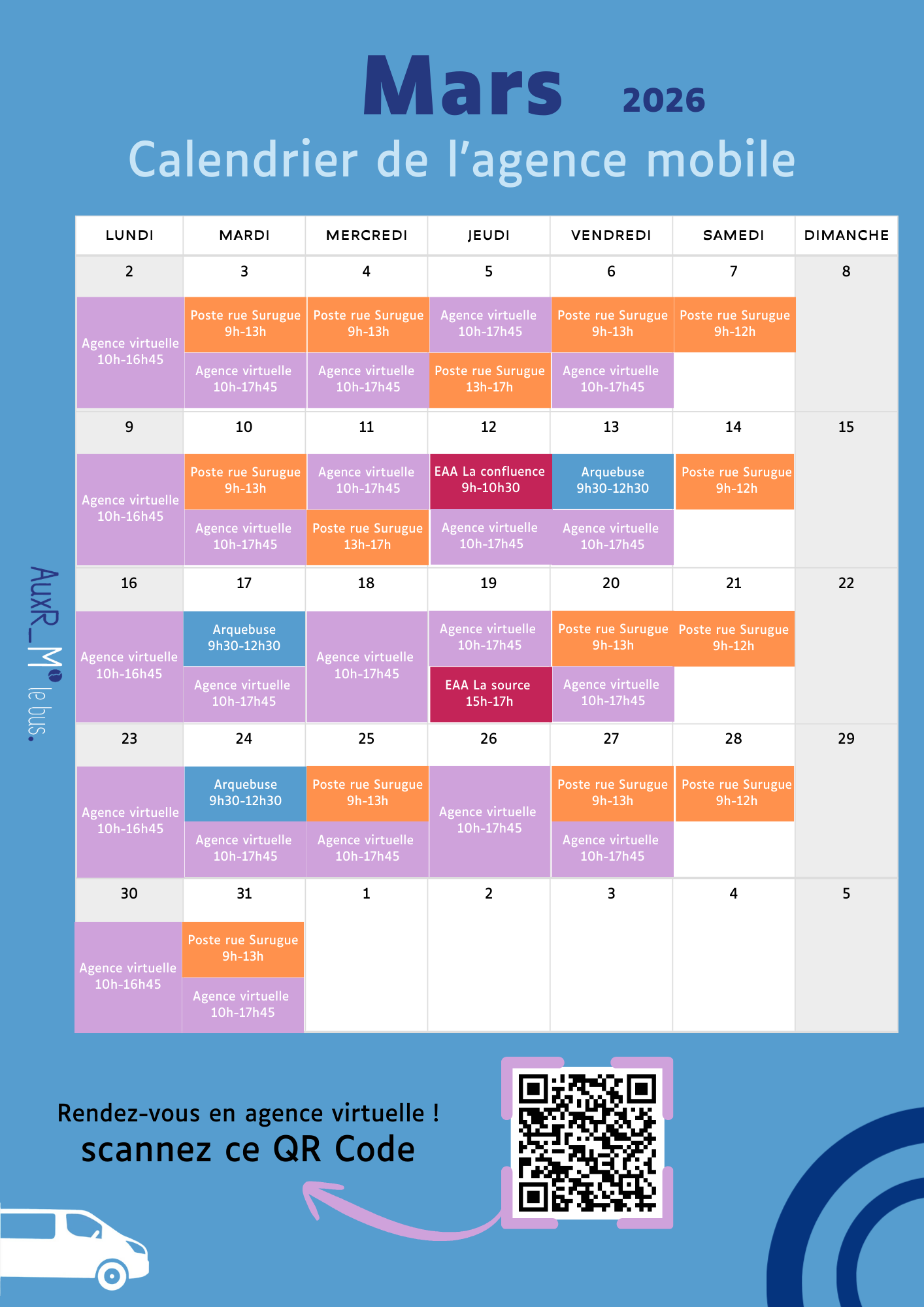 Retrouvez le planning de l'agence mobile pour le mois de mars 2026 !